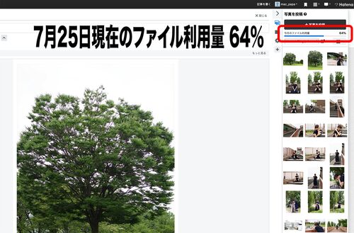 現在のはてなブログのファイル利用量ですが、7月25日の時点で64パーセントまできています。 先月が52パーセントでしたから、大幅に今月の利用量が上回っています。 今月の残り日数はあと6日ですから、これが100パーセント近くまでいくことはないとは思います…