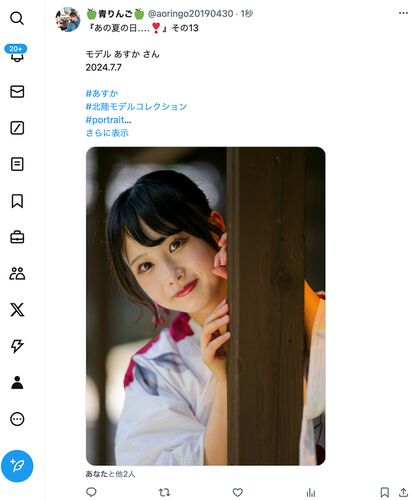 定年退職後2年経ちましたが、相変わらず無職の日々を満喫している青りんごです。 いつもスターやブックマーク、ブログランキングから読者登録まで、たくさんのご支援をいただきありがとうございます 本日のX投稿第2弾は、浴衣姿のあすかちゃんです。 柱の陰…