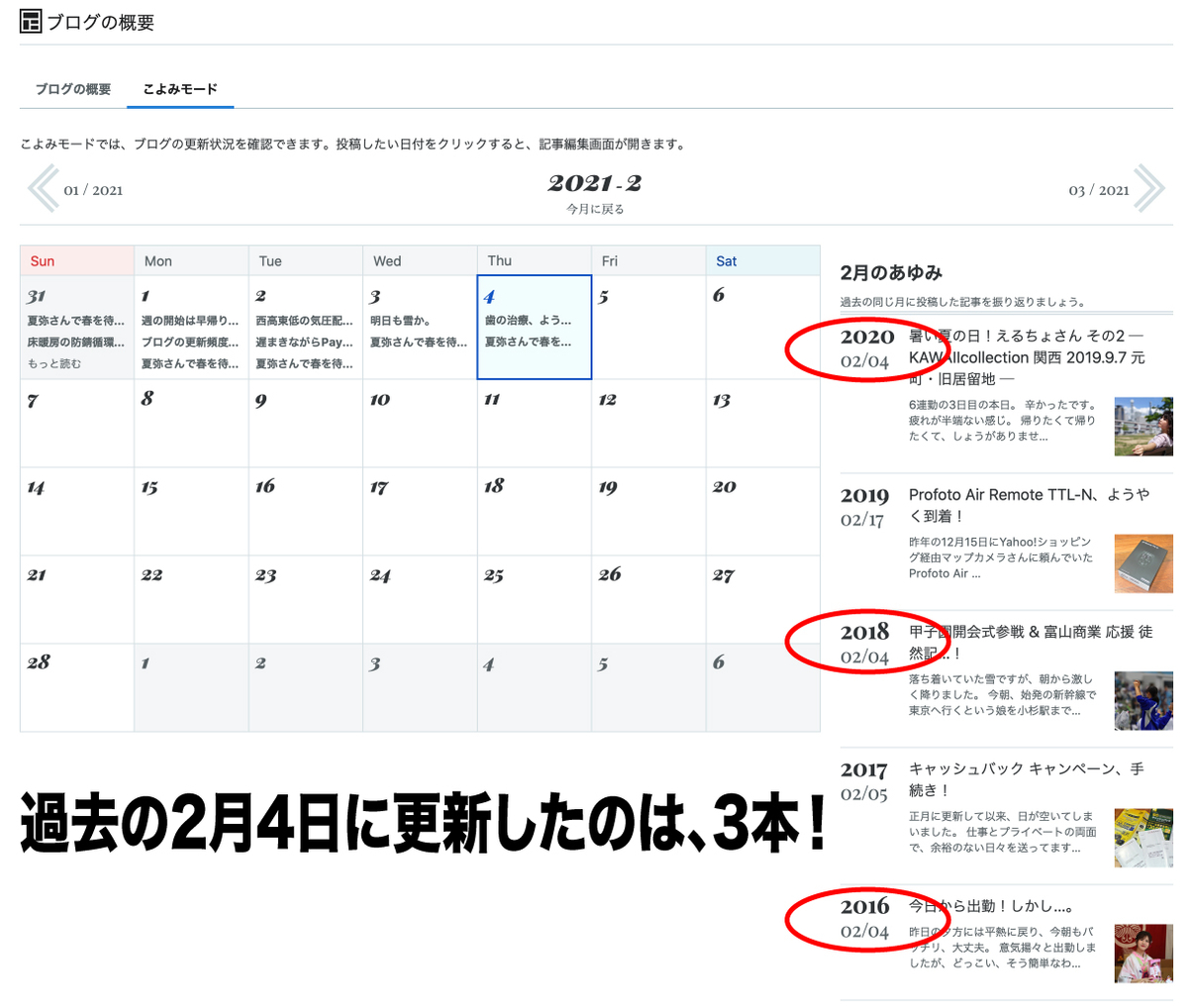 はてなブログのブログの概要「こよみモード」で表示される「2月の歩み」コーナーですが、2月4日分が過去5年で3本該当していました。