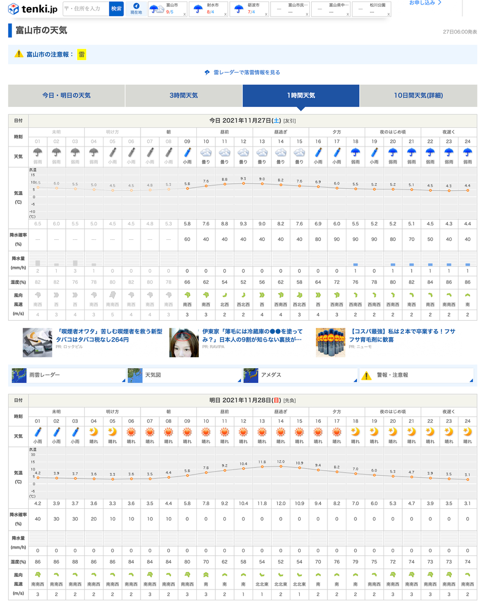 2021-11-27 今日、明日の天気は…。 隣の市なのに、うちの射水市と富山市では、今日の天気に若干違いがありました。 撮影会が行われる富山市は、今日は10時から15時までは雨が降らない模様。 だったら、明日の撮影会の時間帯に合わせてロケハンに行けそう。 ホントかな…?