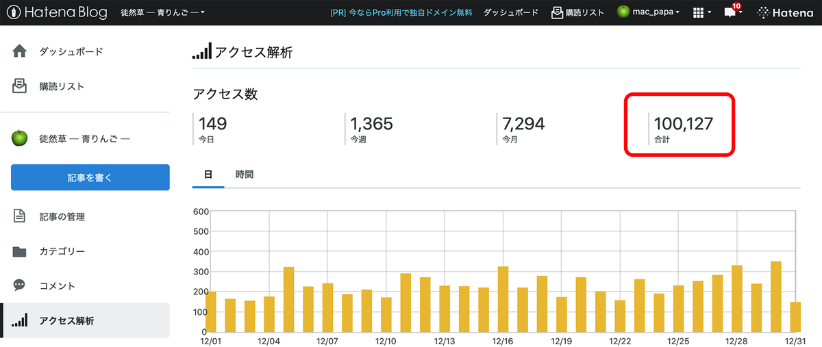 2021-12-31 ブログの総アクセス10万!また、ぼちぼち、ゆるゆると…! いつもスターやブックマーク、ブログランキングから読者登録まで、ご協力いただきありがとうございます😊 はてなブログに乗り換えたのが、2019年の9月15日とのことですから、ここまで2年と3か月ちょいですね。 年内に達成はムリと思っていたのですが、なんとか最終日の大晦日に超えることができました。 これも、訪れてくださるみなさんのおかげです。 また、これからもよろしくお願いいたします。 更新のほうは、ぼちぼち、ゆるゆるですが…。 aoringo723.hatenablog.com