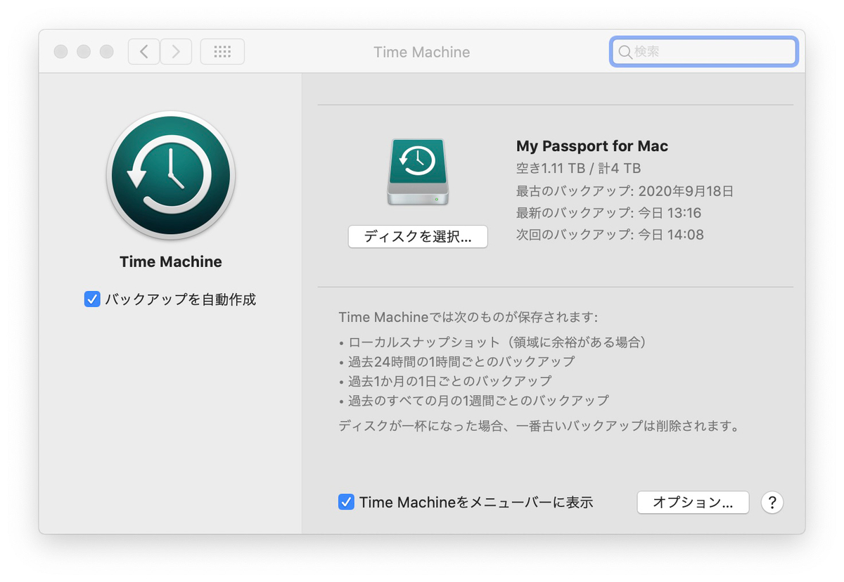 今日、職場で作成した書類をMacBook Proに入れて、Time Machineでバックアップを取れば一安心。