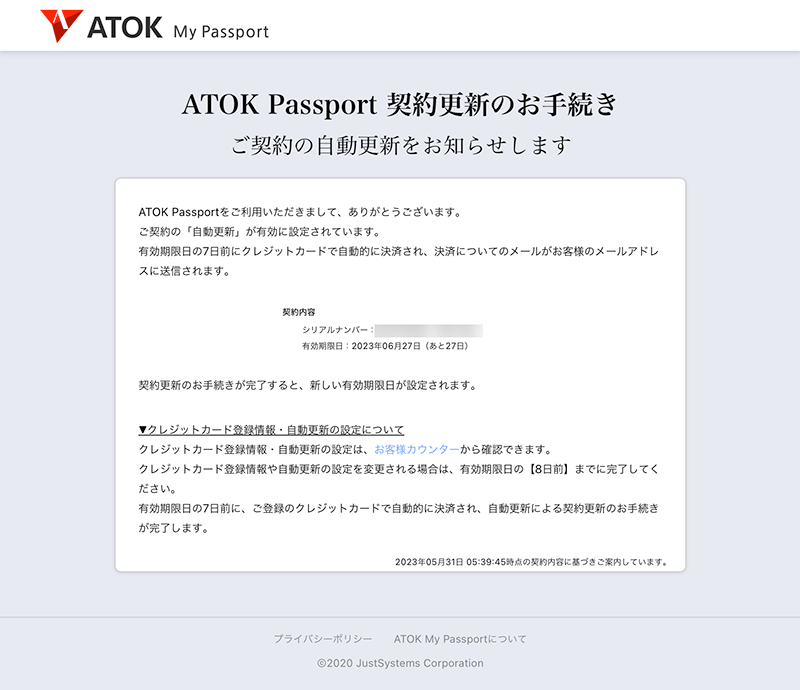 ちなみに、ATOK Passportの有効期限は、2023年6月27日とのこと。