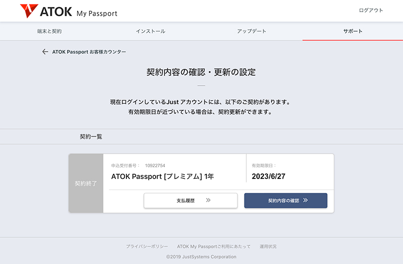 自動更新になっていると思ったATOK Passportですが、どうやら去年の7月で登録していたクレジットカードの有効期限が切れてしまったのが原因で自動更新されなかった模様。
