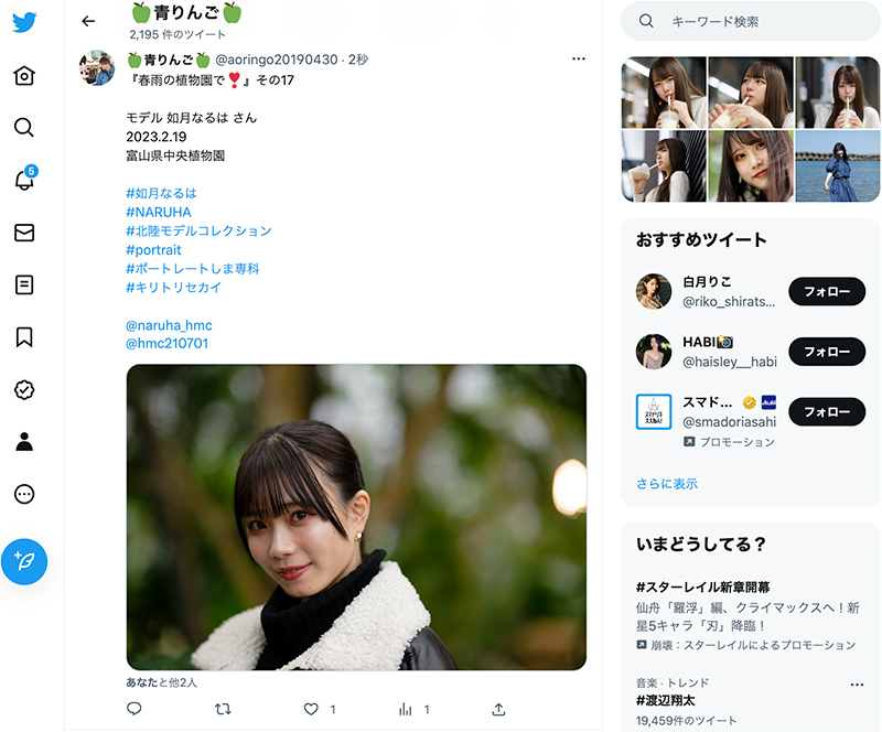 2023-07-19 1日1ツイート! 2023.7.19 その1 ─ なるはちゃん 2023.2.19 富山県中央植物園 ─ 定年退職後1年経ちましたが、相変わらず無職の日々を満喫している青りんごです。 いつもスターやブックマーク、ブログランキングから読者登録まで、たくさんのご支援をいただきありがとうございます😊 本日のTwitter投稿第1弾は、なるはちゃんです。 ビシッとまとめた髪型もステキでした (^^) 現在のファイル利用量 32%。 twitter.com https://twitter.com/naruha_hmc