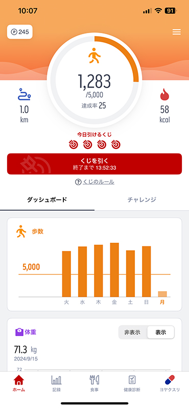 1日に5,000歩歩けば、おそらくは1ポイント当たりますから、先週の7日分で14ポイント獲得。