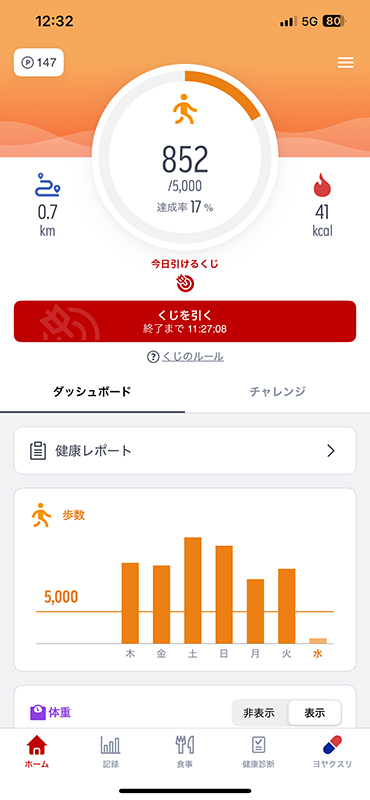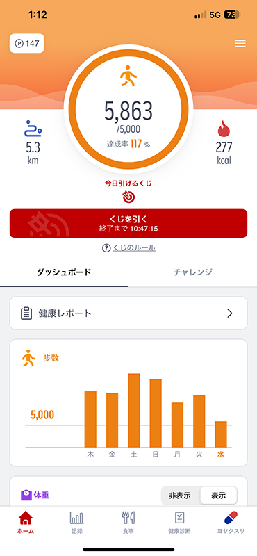 総歩数の記録は、いつもどおり、3分間速歩×5セットのあとランニングを5周し終わったあとの記録になります。