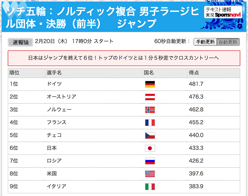 さてさて、ノルディック複合 男子ラージヒル団体ですが、うちへ帰ってきて速報画面を見ますと、前半のジャンプを終えたところで、とりあえず6位にいるんですね。